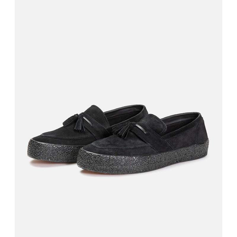 Suedeupper with a”cloudy cush” insole, leather tassels, leather sock liner and a vulcanized rubber outsole.