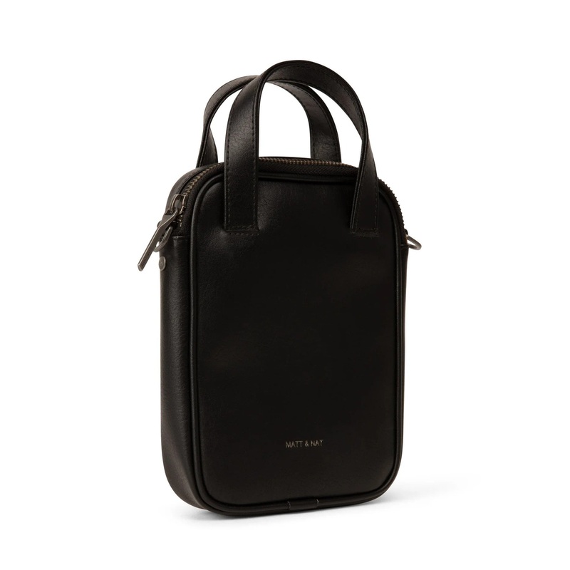 Slim crossbody bag with handles to hand-carry, zippered main compartment, and a detachable and adjustable strap. This bag can fit a large smartphone, a slim cardholder and other small essentials.