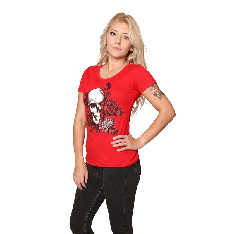 The Metal Mulisha MaidensMorir BonitaCrew NeckT-Shirt;features a largeM/M Skulland Roses “Live Fast Die Pretty” frontscreen print.