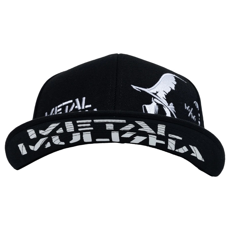 The Muzzle Flex Hat in Black features a large skull embroidery on the left front panel in White, custom printed underbill, custom sweatband, small M/M on left side in White and Metal Mulisha logo on back in White.