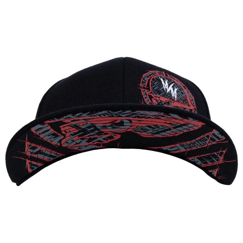 The Shred Flex Hat in Black features a large screenprint in Grey, White and Red on the left front panel, custom printed underbill, custom sweatband, small skull on left side in Red, Grey and White and M/M logo on back in Red.