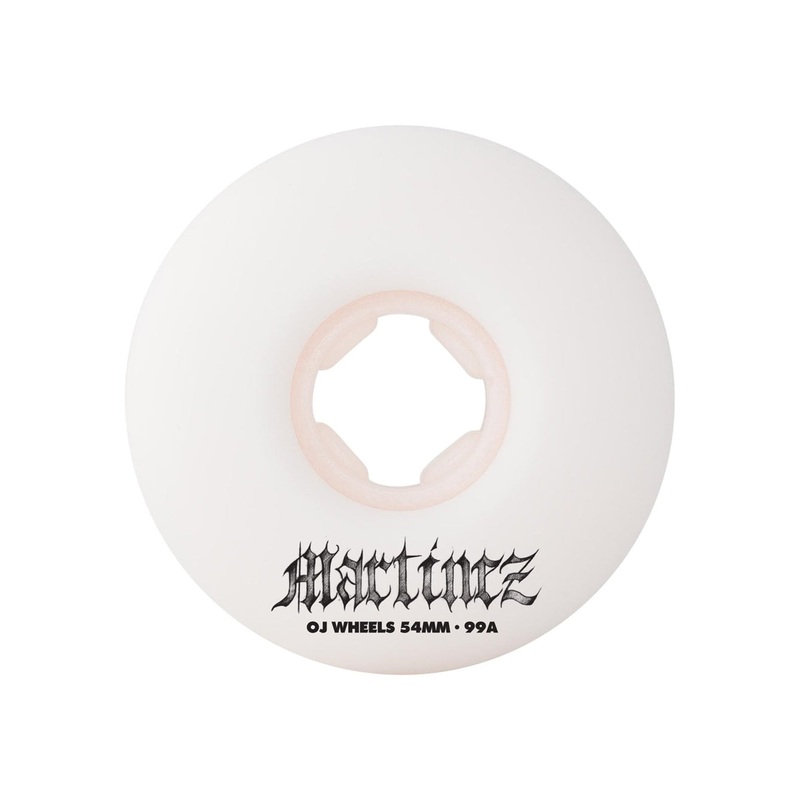 OJ Wheels 54mm, 99a Milton Martinez Guero Original Pro Chubbies wheels white with metallic silver graphics. OJ’s all new Chubbies shapes feature a super-wide riding surface for the best slides, with big round radial edges that make getting on-and-off of curbs, ledges, and edges effortless.