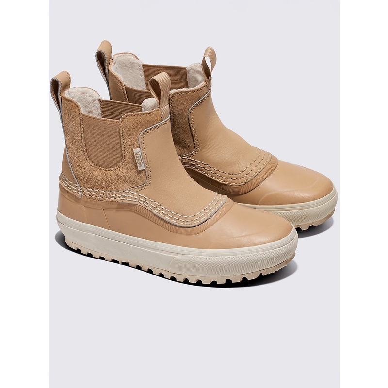 Practical, packable, and wear-at-the-bar-able, the MTE Standard Mid Chelsea Waterproof Boot is a downsized version of Vans best-selling Standard snow boot with easy slip-on access. Featuring a waterproof vulcanized lower, waterproof seam-sealed construction, 100-gram weight insulation package, and a Standard Snow MTE outsole featuring All-Trac all-terrain rubber, classic Vans style and day-to-day winter weather footwear have finally converged. This mid-top boot features stretch gore at the opening, and is made with leather and rubber uppers.