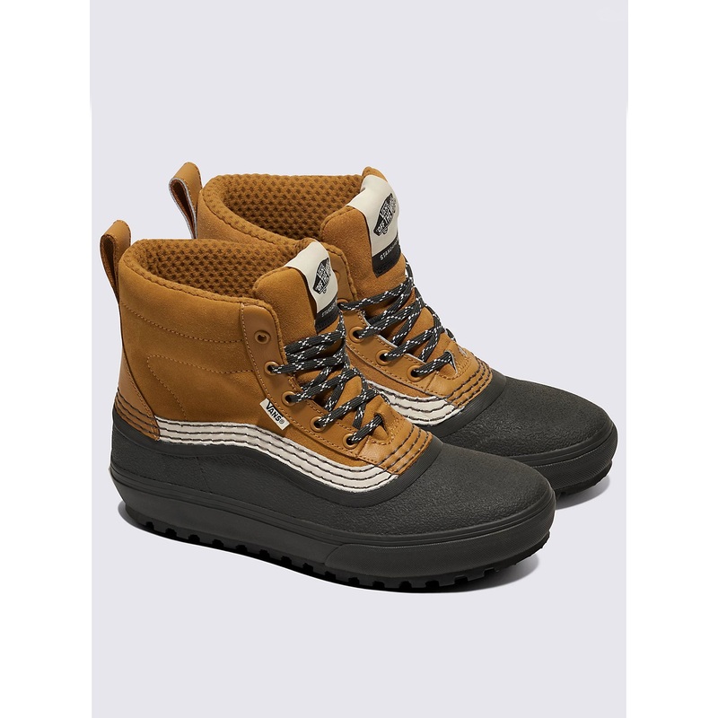 Practical, packable, and wear-at-the-bar-able, the MTE Standard Mid Waterproof Boot is a downsized version of Vans best-selling Standard snow boot. With a waterproof vulcanized lower, waterproof seam-sealed construction, 100-gram weight insulation package, and a Standard Snow MTE outsole featuring All-Trac all-terrain rubber, classic Vans style and day-to-day winter weather footwear have finally converged. This mid top boot is made with leather and rubber uppers.