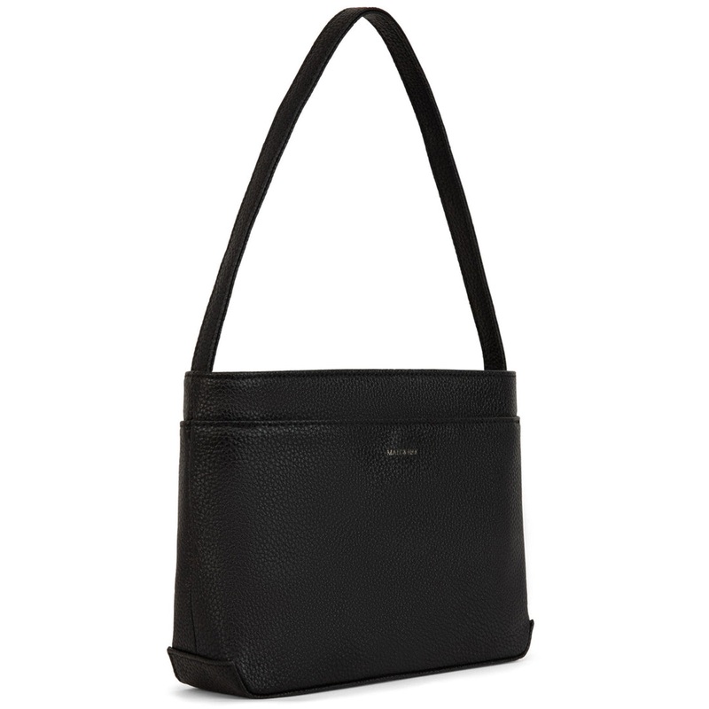 Shoulder bag with a zipper closure at main compartment and exterior slip pockets at front and back with snap button closures.