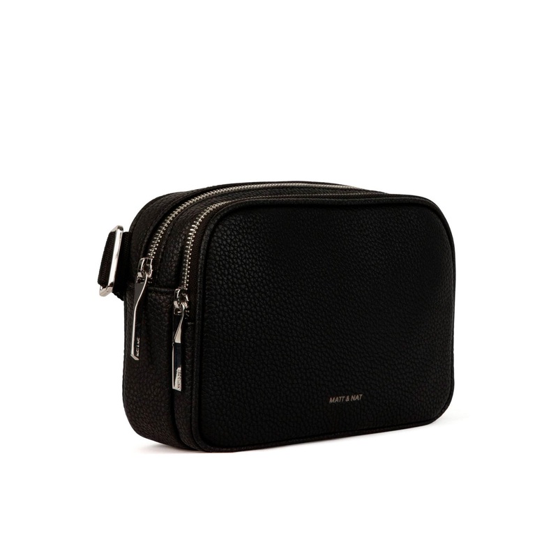 Belt bag with two zippered compartments, a flat pocket with snap closure and a single card slot at the exterior back. Adjustable belt strap for comfortable wear around the waist or across the chest.