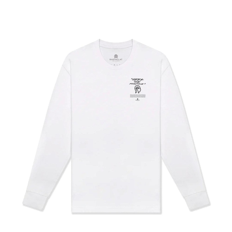 The Boardwalk LS tee is a classic white tee featuring a crew neck, long sleeves, ‘Seek the Positive’ front artwork and back graphic symbolizing Rastaclat’s Long Beach, CA heritage.