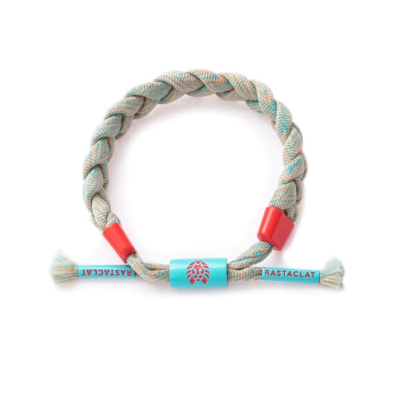 A summery take on the handcrafted movement, this braided bracelet features a two-tone tan and turquoise colorway, frayed tassels, and enamel hardware with contrast emblems.