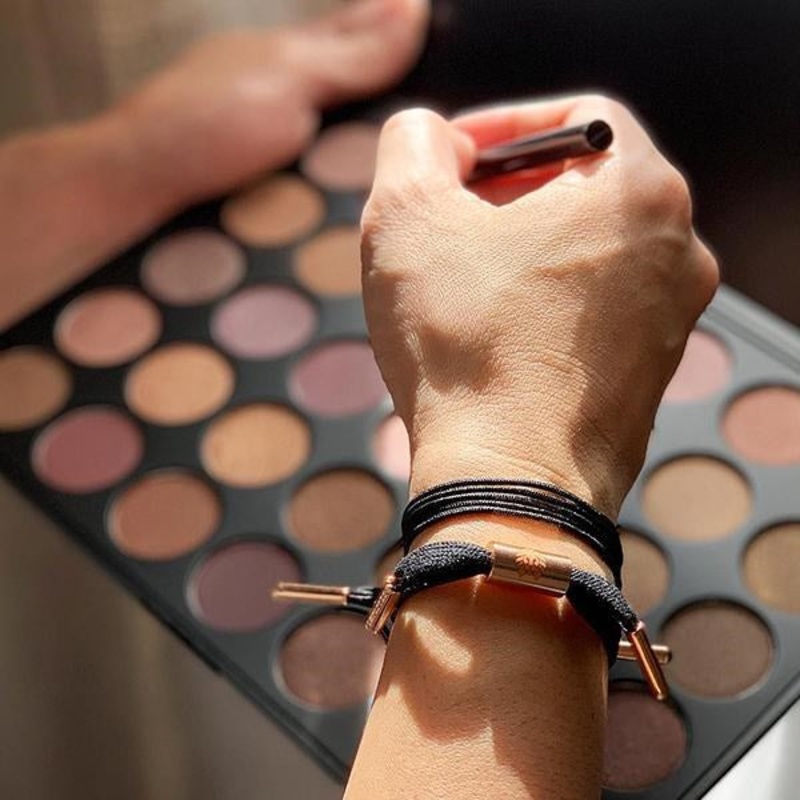 BLACK WOMEN’S MULTI LACE BRACELET FEATURING ELECTROPLATED PEACH GOLD HARDWARE AND LASER ETCHED EMBLEMS.