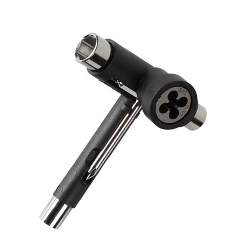 The Utilitool by Reflex is the only tool you’ll ever need. A combination of 8 essential tools in one makes it the perfect choice for skateboarding. With this tool you can rehab trucks with damaged axels instead of replacing them and swap bearings with ease. See the how to section on our site for instructions on these procedures. 5/16″ axle re-threader, 9/16″ socket, 1/2″ socket, 3/8″ socket, 7/32″ allen wrench, 1/8″ allen wrench, Phillips head screwdriver, Bearing press/remover. Available in black and orange.