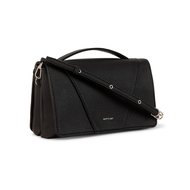 Crossbody bag with two compartments, flap with magnetic snap closure, a top handle to hand-carry, and a detachable and adjustable crossbody strap.