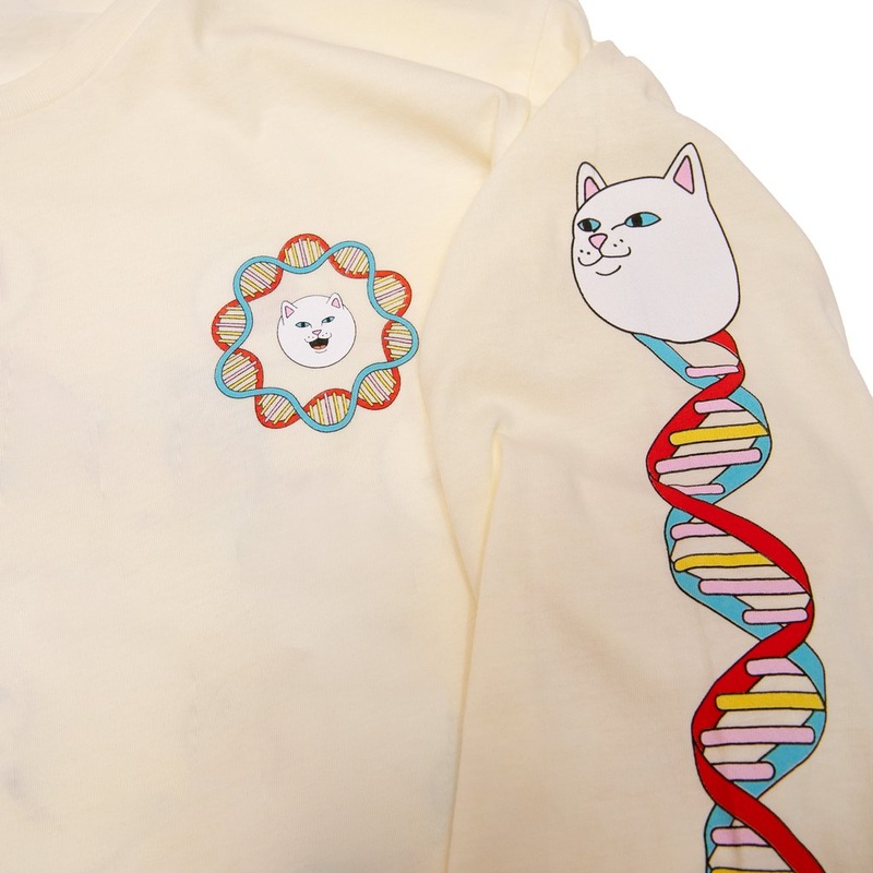 The RIPNDIP DNA Long Sleeve T in natural features a large back print and graphics down both sleeves. On the front there is a small pocket print detail on left of chest.