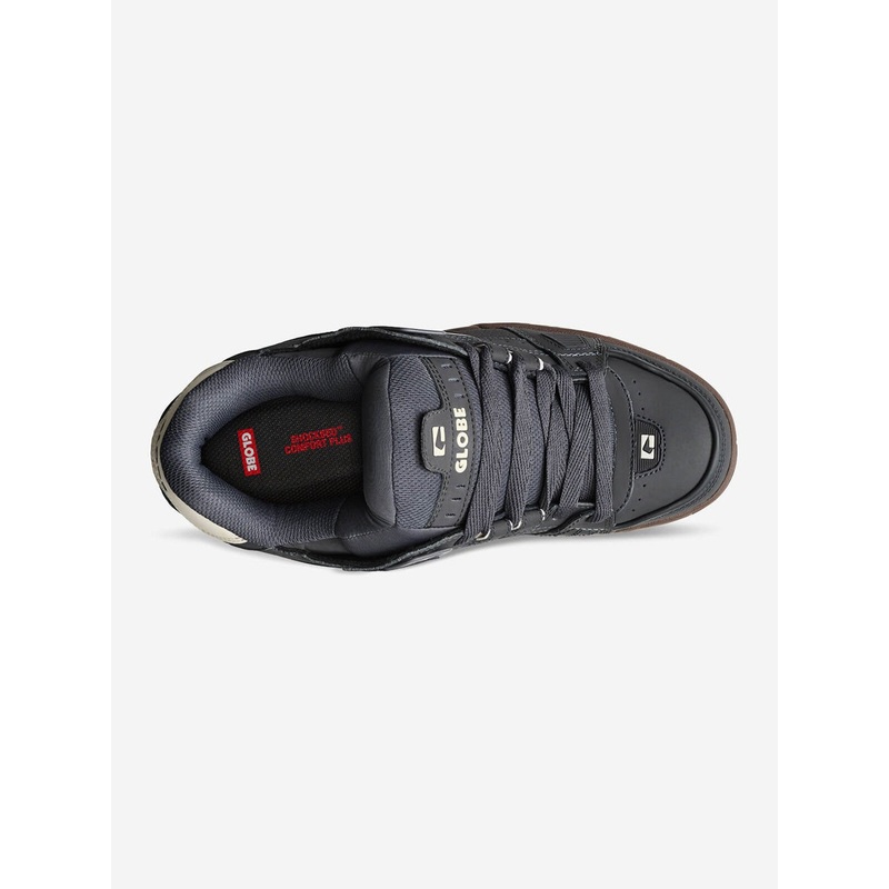 The Sabre in Lead/Gum is an ultra heavy duty skate style with a slip on sock construction for comfort and stability featuring step-in sock liner, Nitrocel airbag sole and Globe’s S-Trac sole pattern.
