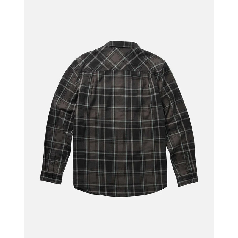 The Daybreak Flannel is a L/S woven shirt featuring mid-weight cotton blend twill (185 gsm), yarn dyed plaid, dual chest pockets with buttoned flaps, branded swirl buttons and soft hand garment wash.