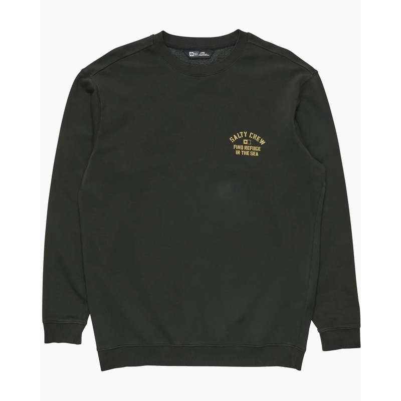 The Even Keel Midweight Fleece Crew in Vintage Black is made from our signature Cotton/Polyester Brushed Fleece, 300gsm in weight. Featuring a rib knit neckband, cuffs, and hem, and a Salty Crew clamp label at the hem edge. Finished with screen printed front and back prints.