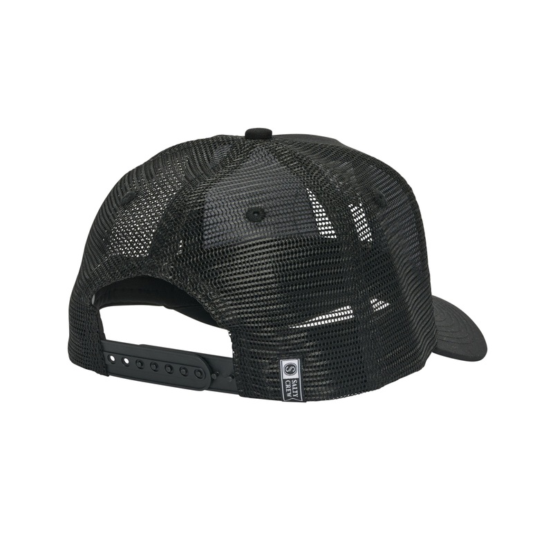 Jimmy 5 Panel Trucker Cap in Black is a structured 5 panel, mid-crown height trucker cap. Made from Cotton Canvas & 100% Polyester Mesh, cotton patch with transfer print & merrowed edge at front, moisture wicking sweatband and plastic snapback at back for closure.
