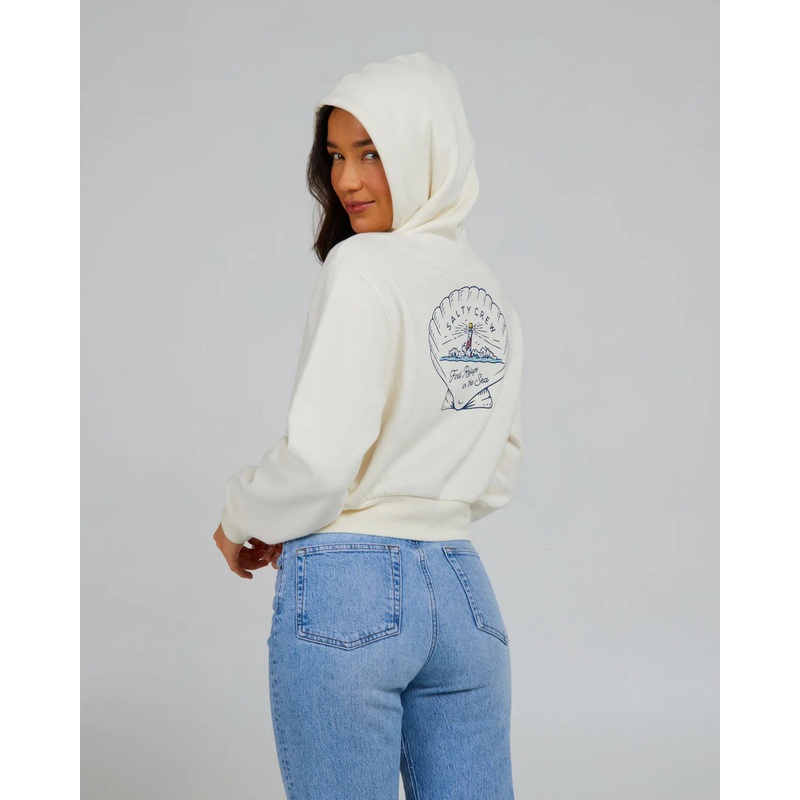 The Scallop Crop Hoody in Off White is a stylish cropped pullover with a screen print on the front chest and back. It offers a modern, comfortable fit that’s perfect for casual wear.