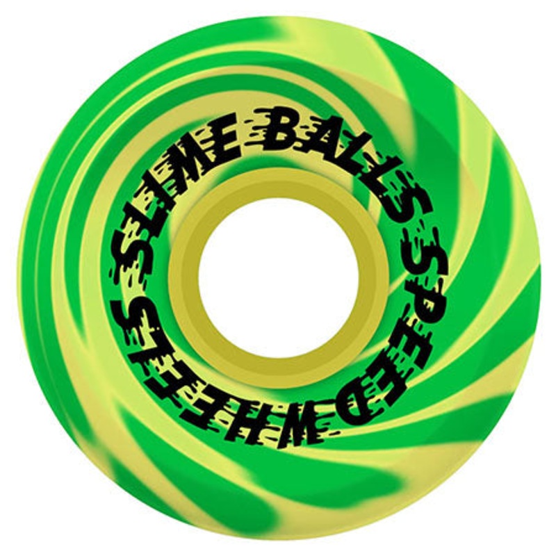 Slime Balls 60mm OG Slime Spewage Yellow Green Swirl with heritage Slime Ball Speed Wheels graphics. OG Slime is a versatile, symmetrical center bearing cruiser wheel shape with soft, all terrain 78a urethane.
