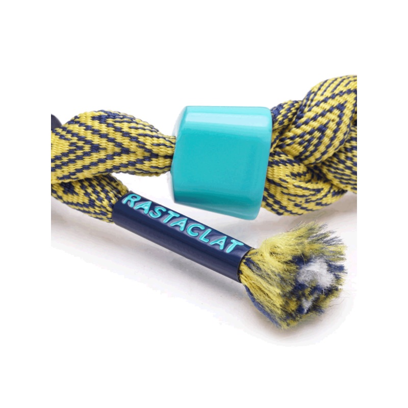 A summery take on the handcrafted movement, this braided bracelet features a two-tone yellow and blue colorway, frayed tassels, and enamel hardware with contrast emblems.