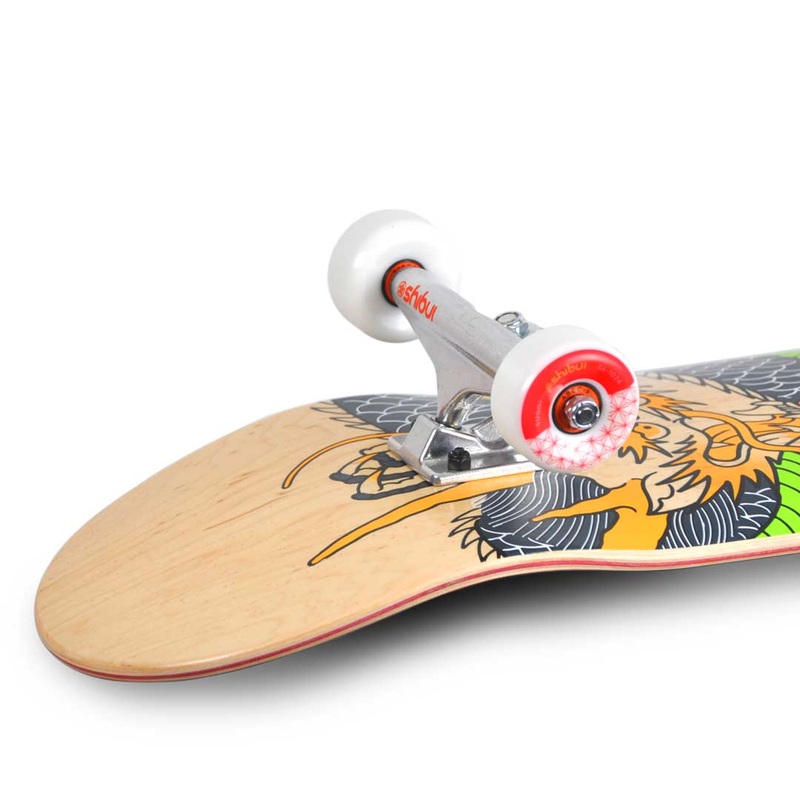 The Shibui Ryu Dragon Skateboard measures 8.25″ wide and features a popsicle medium concave 100% USA / Canadian hard rock maple deck sourced from managed forests in the great lakes region. Other hardware includes Shibui 139mm Street trucks, Shibui 56mm 102A wheels and abec 7 bearings.