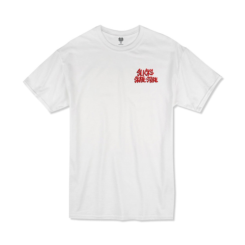 We’ve teamed up with @fosgraphics, owner of Heroin Skateboards, to bring out the Slick’s Skate Store Fos Crossbones T-Shirt !