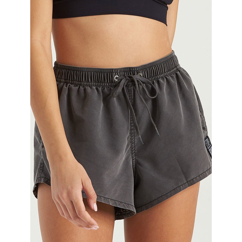 Surfed-out and sun-faded, the Sol Searcher Overdyed Volley brings a vintage finish to the essential swim short. Made from recycled fabric, the womens elastic waist boardshort is finished with a patch at the hem and drawcord at the waist.