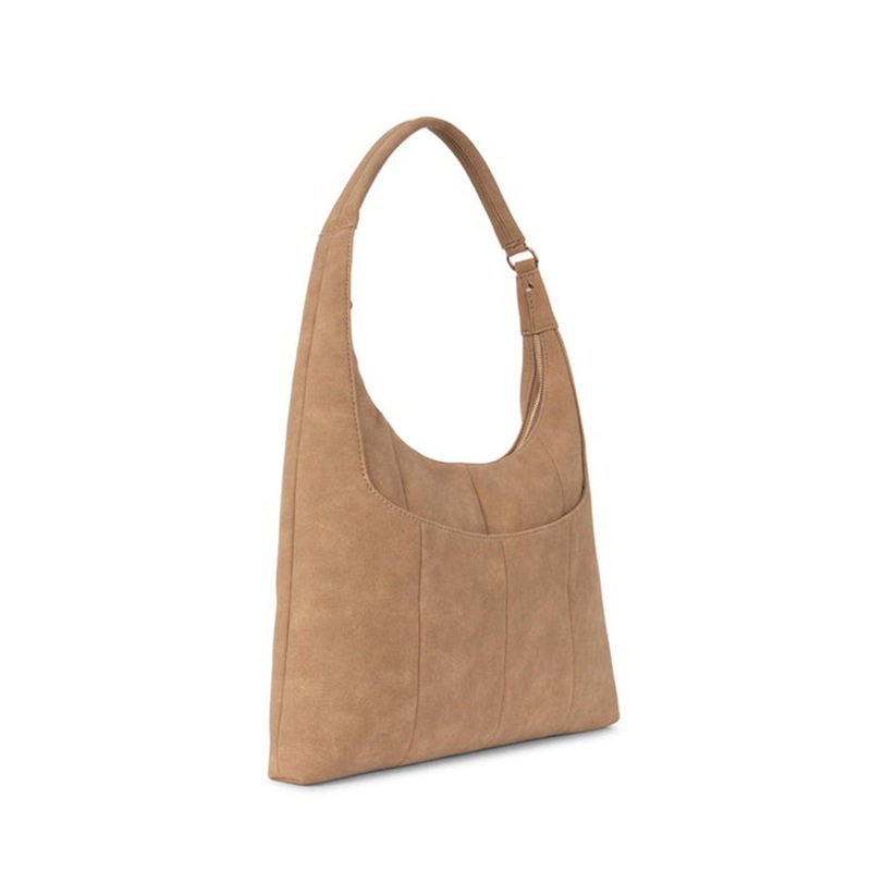 Shoulder bag with a double zipper compartment and an adjustable strap.