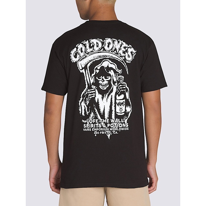 The Skull Reaper Spirit World T-Shirt is a classic fit short sleeve crew neck T-shirt with a screenprinted graphic of the Vans logo on the left chest, and the grim reaper with a cold one on the back.