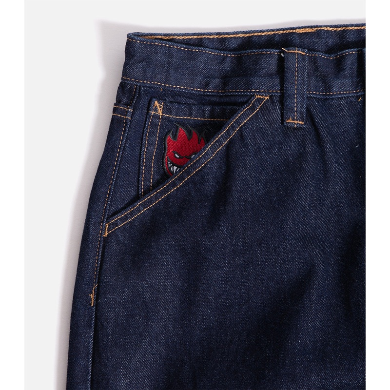 Denim pants with custom embroidery on the rear pockets and an embroidered graphic in the front right pocket.