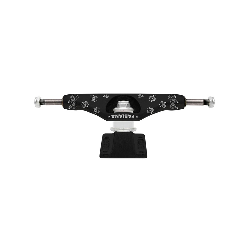 Independent Trucks Fabiana Defino Pro Stage 11 Hollow featuring black fine-texture powder coated finish with laser engraved all-over bandana theme on hanger and baseplate, white cushions, silver hardware, and custom punk pin style keychain hangtag.