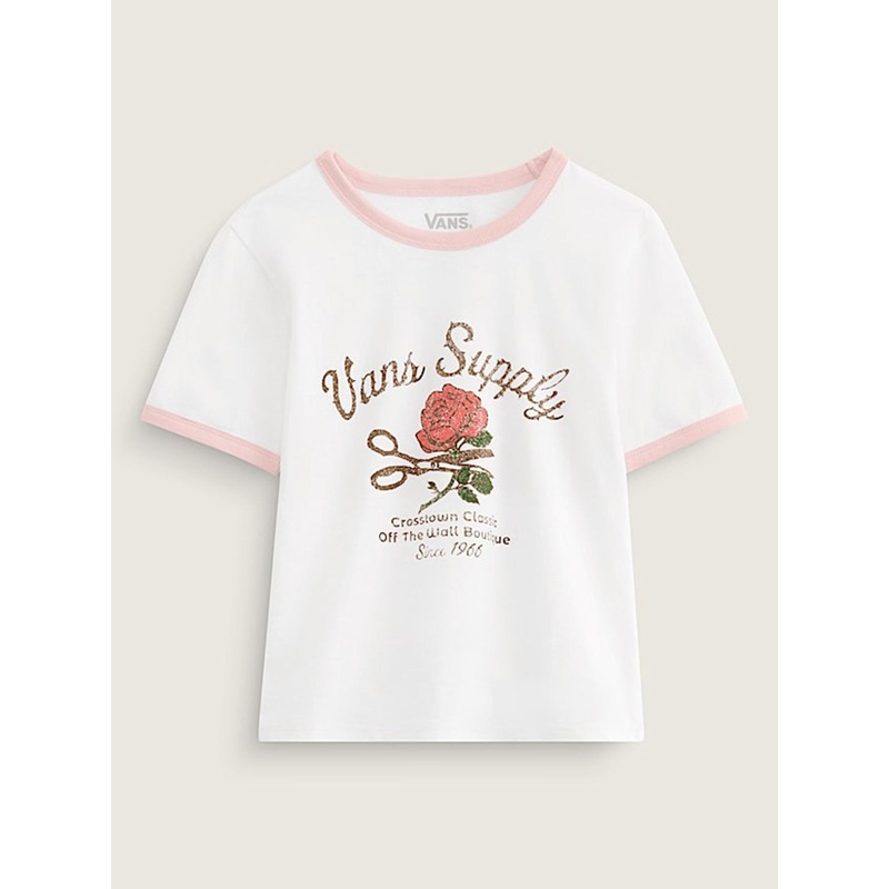 Make a thorny statement in the Kids Supply Boutique Ringer T-Shirt, a crew neck T-shirt with a thorny Vans Supply graphic and a rose with scissors on the front.