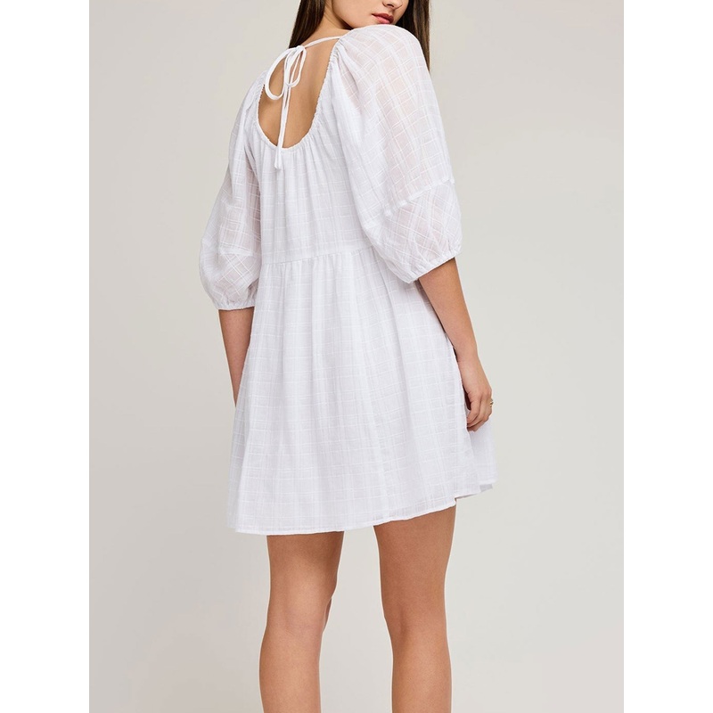 The Tallulah dress is made of a textured cotton plaid fabric and is fully lined for ease of wear. Features include a scoop neckline and adjustable back tie.