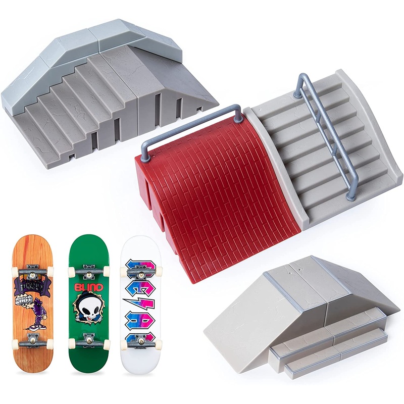 - Includes: Three fully assembled single boards, Venice Ledge (1 left bank, 1 right bank, 2 connectors), Hubba Hideout (1 bank, 1 bank Ledge, 1 Stair Set, 1 stair set ledge, 2 ledge tops, 2 connectors, 4 ledge connectors), Brooklyn Banks (1 Brick Bank, 1 Stair Set, 1 Stair rail, 1 Bank rail, 4 connectors)