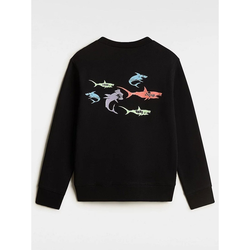 Take the lead in the Little Kids The Pack Fleece Sweatshirt, a cozy long sleeve crew neck sweatshirt a glow-in-the-dark screenprinted shark with the Vans logo on the front, and a pack of sharks on the back.