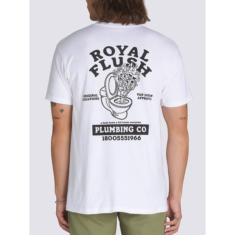 Pay homage to Vans co-founder Paul Van Doren in the Royal Flush T-Shirt, a classic fit short sleeve crew neck T-shirt with a screenprinted graphic of the Vans logo on the front, and a retro Vans-style plumbing ad on the back.