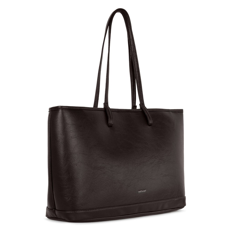 Tote with a magnetic snap closure and a removable zippered pouch inside.