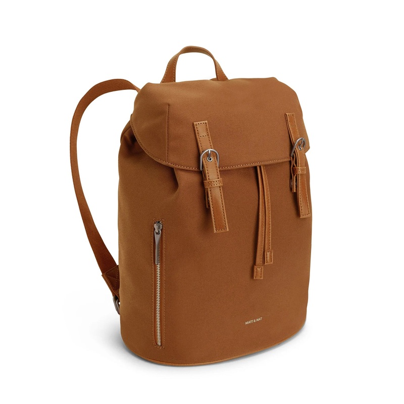 Backpack with drawstring and double magnetic snap flap closure, adjustable webbing straps, top handle, and a front zippered pocket. Fits an 11″ iPad.