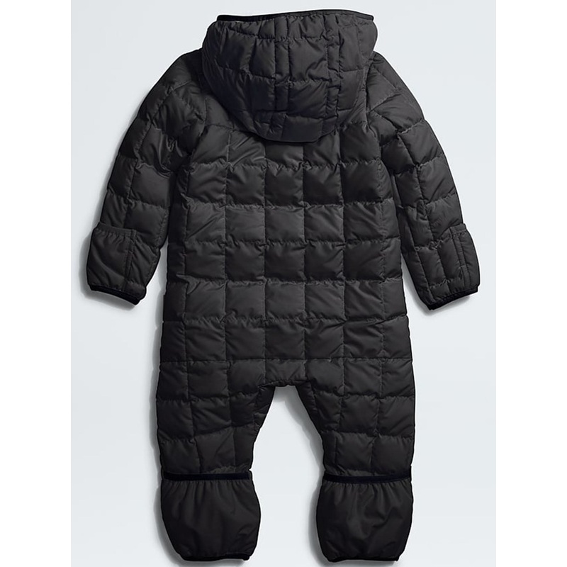 Filled with lightweight, 100% recycled body insulation, the Baby ThermoBall One-Piece is the ideal all-in-one layer for their first few winters. With an attached hood, fold-over mitts and booties, plus a water-repellent finish, theyll have the coverage they need for new adventures in the outdoors.