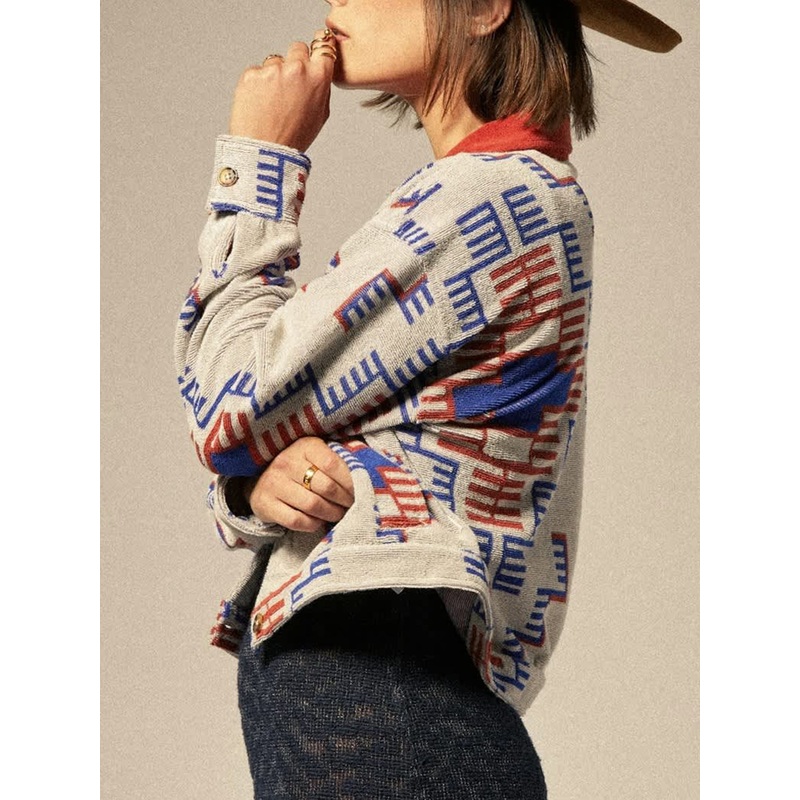 Turn heads in this vintage-vibey Trail Terry Cloth Trucker Jacket. Crafted from a soft terrycloth blend, it offers both comfort and durability for versatile all-day wear. The bold yarn-dyed electronic indigo pattern adds exciting visual texture, making it the perfect statement piece for layering. A center front button closure ensures functional ease, while the classic trucker jacket silhouette brings timeless structure to your wardrobe. Pair it with your favorite jeans for a laid-back weekend style or layer it over a dress for an artsy touch.