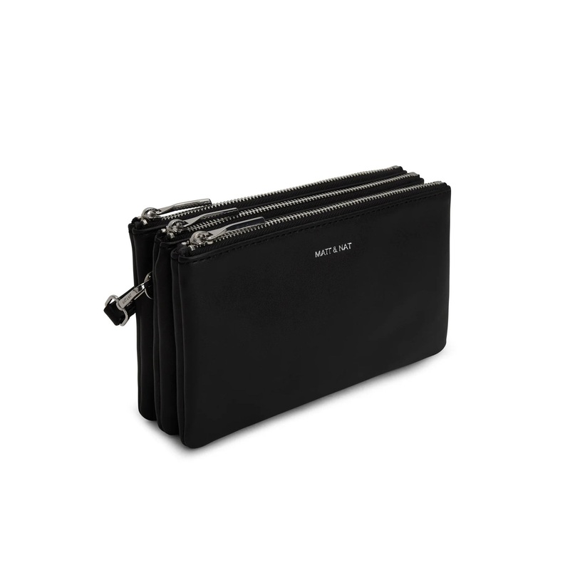 Crossbody bag that can be used as a pouch with removable and adjustable straps. Three separate compartments with top zipper closures.