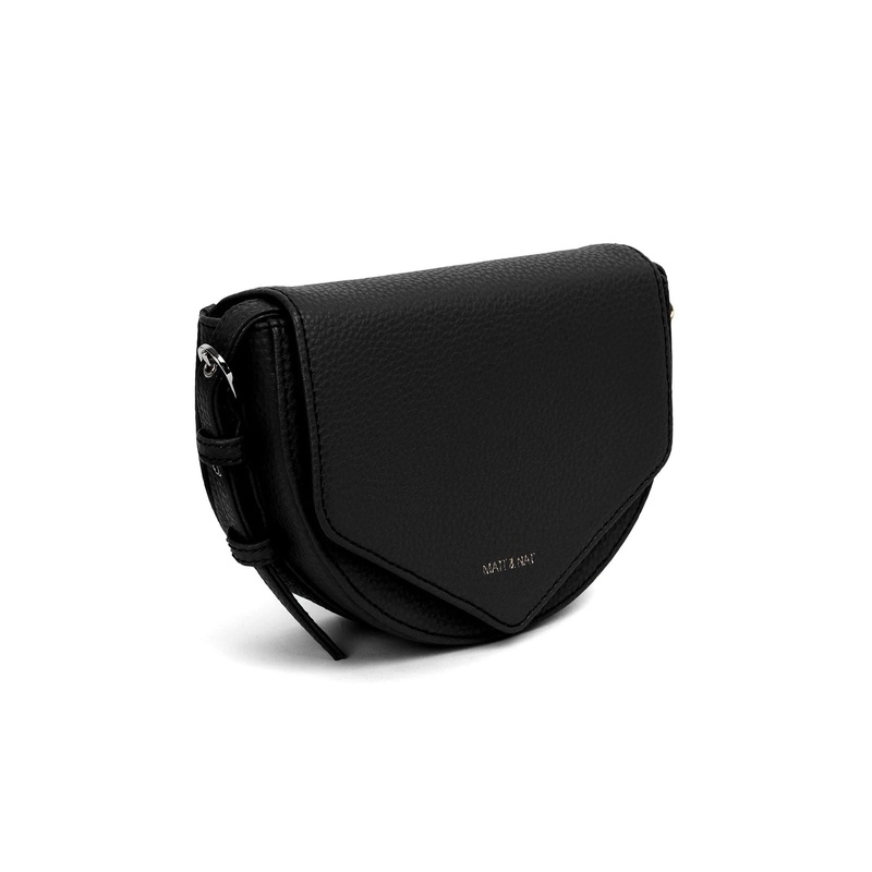 Saddle crossbody bag with flap closure, adjustable strap, and a card slot at the exterior back.