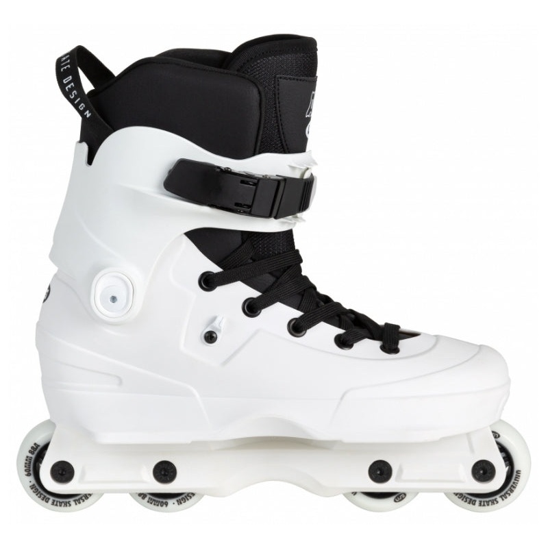 Its unique unibody construction combines the frame and boot into a single piece, reducing weight and bringing the wheels as close to the foot as possible, making the skate incredibly responsive. The Aeon Team 60 White has a taller, height-adjustable cuff for excellent support and a thick shock absorber to provide extra cushioning when youre landing big gaps.