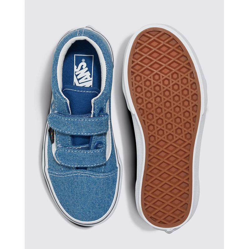 The Kids Old Skool V Denim reimagines our iconic Sidestripe shoe by swapping traditional laces for double hook-and-loop closures. Made with denim uppers featuring mini butterfly, daisy, and heart patches along the Sidestripes, this low-top style maintains its classic appeal while providing an easy, secure fit that ensures all-day comfort.