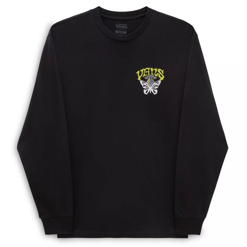 The Skull Saucer Long Sleeve T-Shirt in Black has a crew neck and features the Vans logo on the left chest. The logo is also on the back with skull graphics. It has a classic fit.