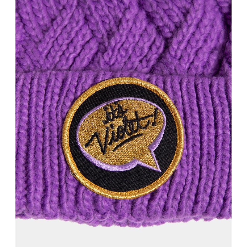 Cotton knit beanie with embroidered patch and fury pom pom.