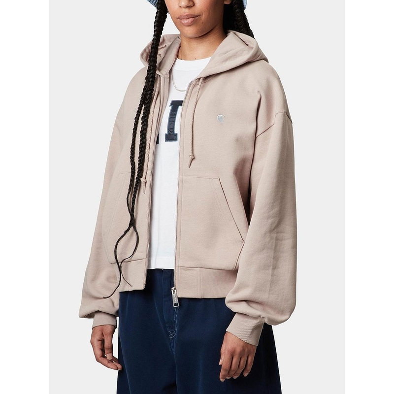 Made from heavyweight 12.3 oz cotton jersey, the Women’s Hooded Casey Jacket is cut to a balloon fit, which is a little looser and boxier, but also characterized by dropped shoulders and ribbed cuffs that create a cinching effect. The jersey fabric has also been brushed to give it a fleece-like backing. An embroidered silver-tone ‘C’ Logo appears on chest.