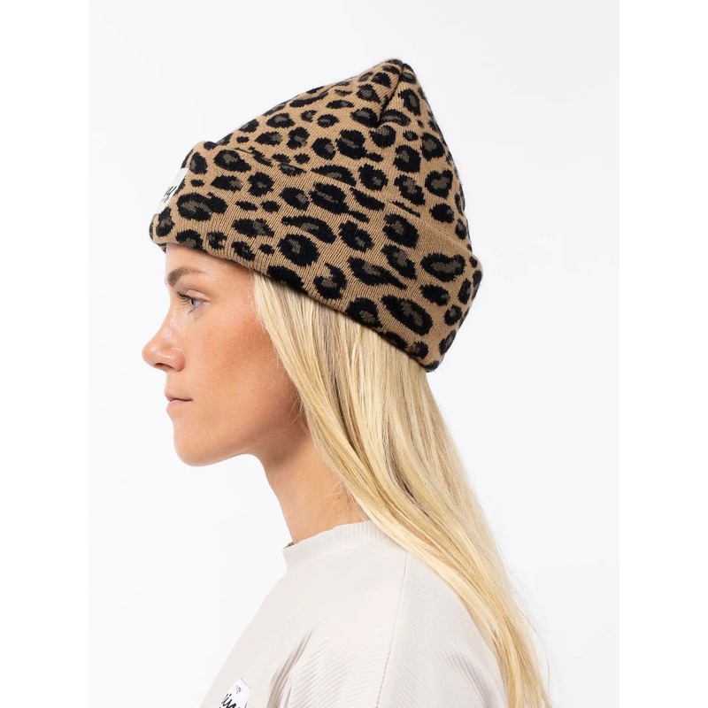 Mid tall leopard patterned beanie with a woven patch in the front made of thick and soft fabric. The circular knitting results in no side seam for ulitmate comfort.