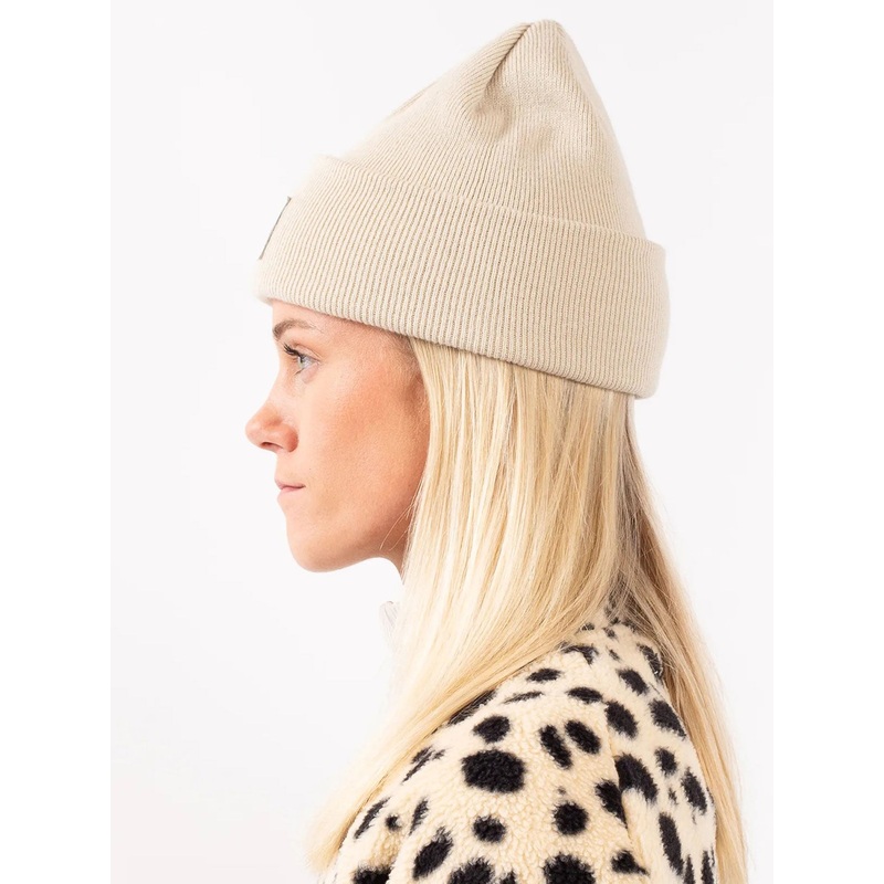 Mid tall off white beanie with a woven patch in the front made of thick and soft fabric. The circular knitting results in no side seam for ulitmate comfort.