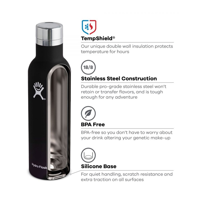 Our 25 oz Wine Bottle makes it easy to bring your favorite vintages along on any adventure. It holds an entire bottle of wine and features TempShield double wall vacuum insulation to keep your favorite wine at the perfect temperature. And, since its made with durable pro-grade stainless steel, it wont retain or transfer flavors, which means tonights Ros wont pick up any notes from last weeks Zinfandel.