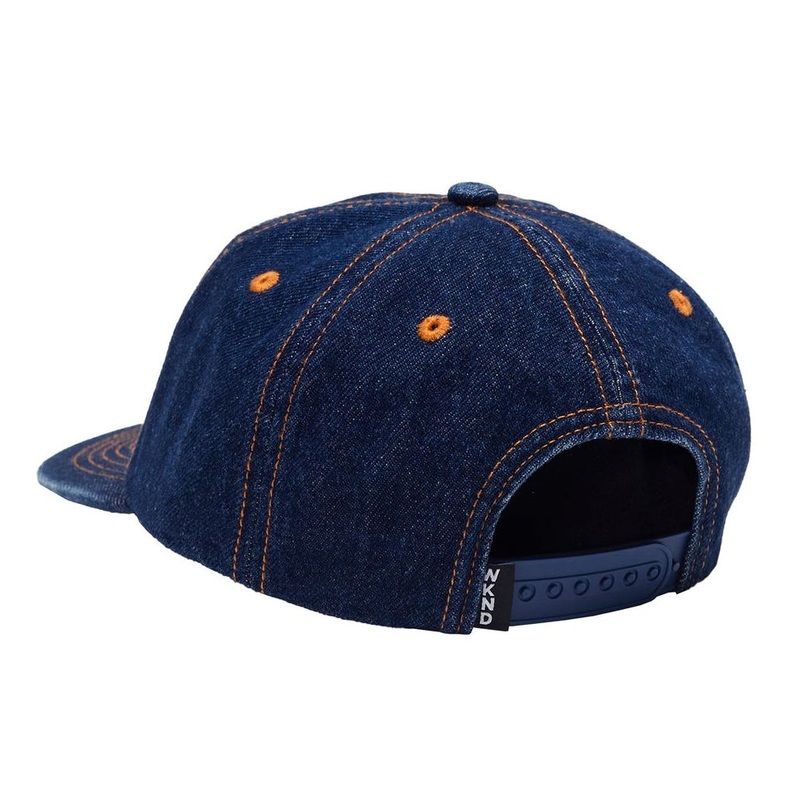 The Fishbone Denim Snap-Back Hat from WKND has embroidered branding on front. Yellow Constrast stitching and yellow strap.